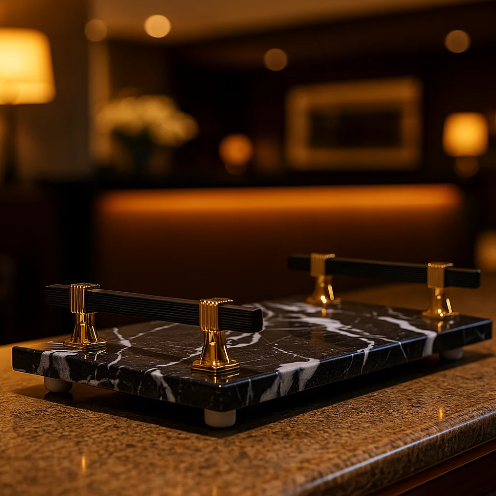 Made from high-quality Nero Marquina marble, this tray is built to last, with durability that ensures it will remain a treasured piece for years to come. The black and gold handles are carefully crafted to provide a comfortable grip, making it easy to move from room to room.